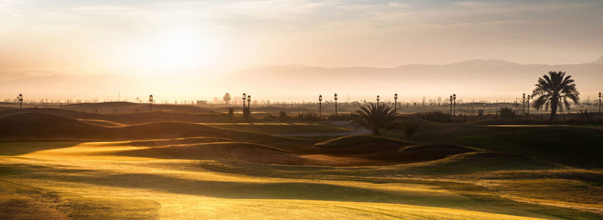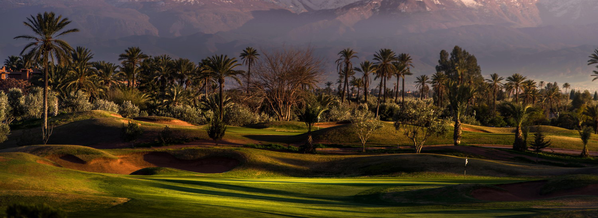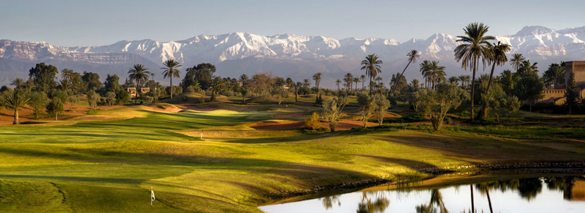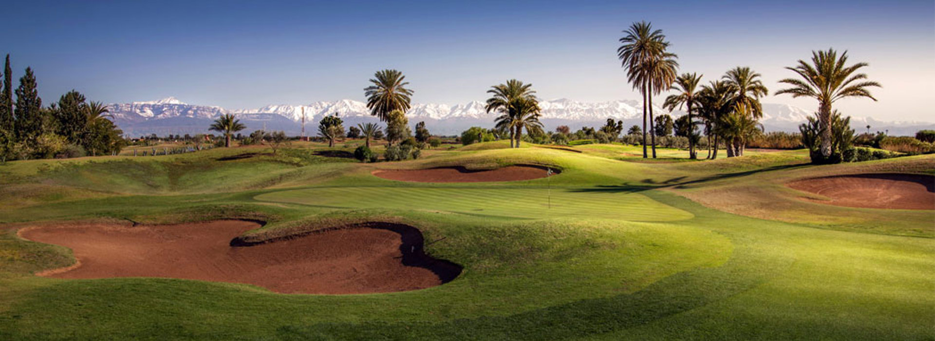 Die Golfanlage vom Amelkis Golf Club befindet sich in Marrakech und bietet spektakuläre Ausblicke auf das schneebedeckte Atlas-Gebirge.