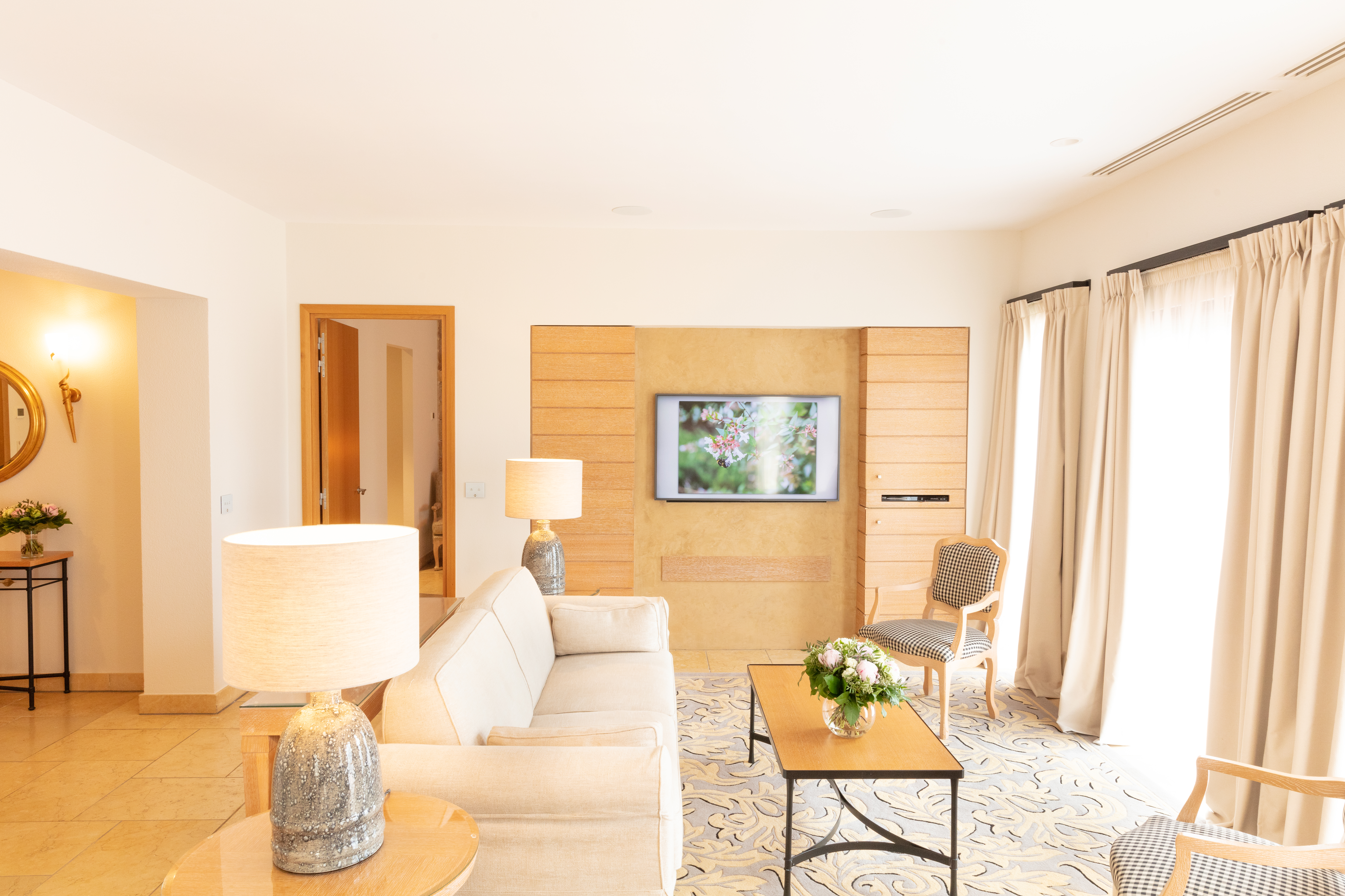 Alle 115 Suiten (60 m2) und Villen verteilen sich auf mehrere ein- und zweistöckige Gebäude in der grosszügigen Gartenanlage. Die Ausstattung ist hell, modern, elegant und geschmackvoll. Alle Einheiten verfügen über getrennten Wohn- und Schlafbereich, Terrasse, DVD-Player, SatTV, Safe, Minibar, gratis WiFi.