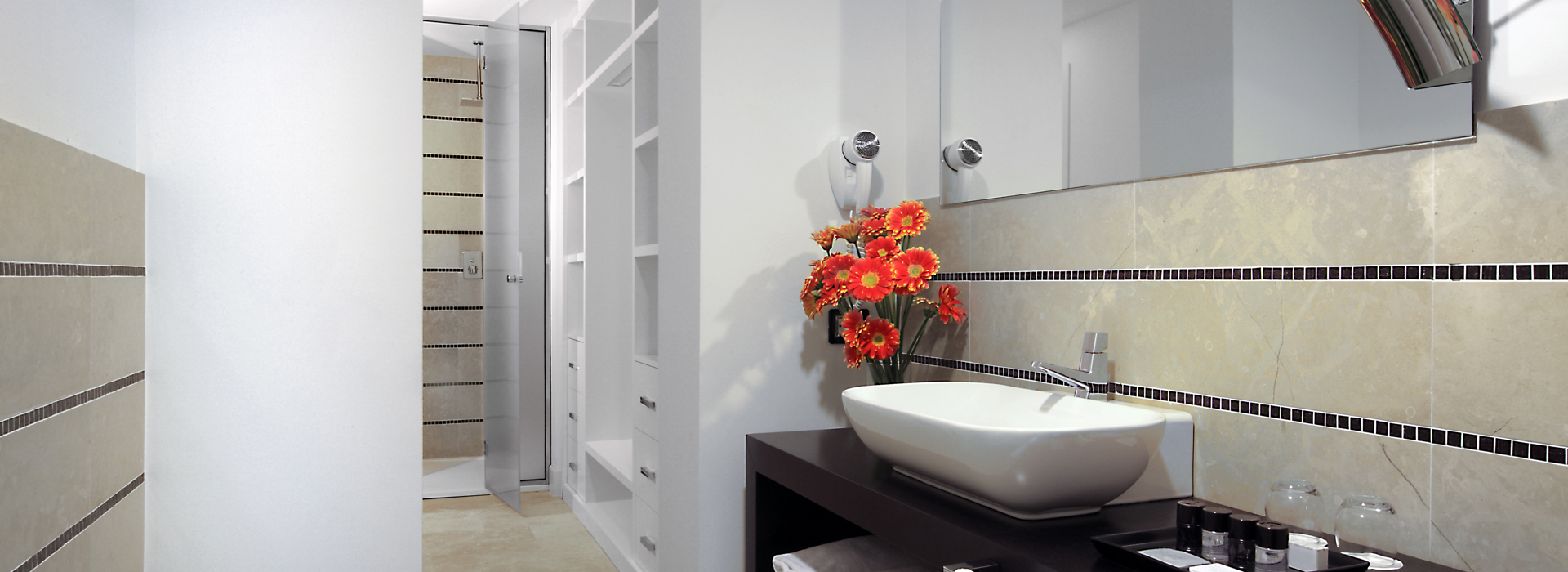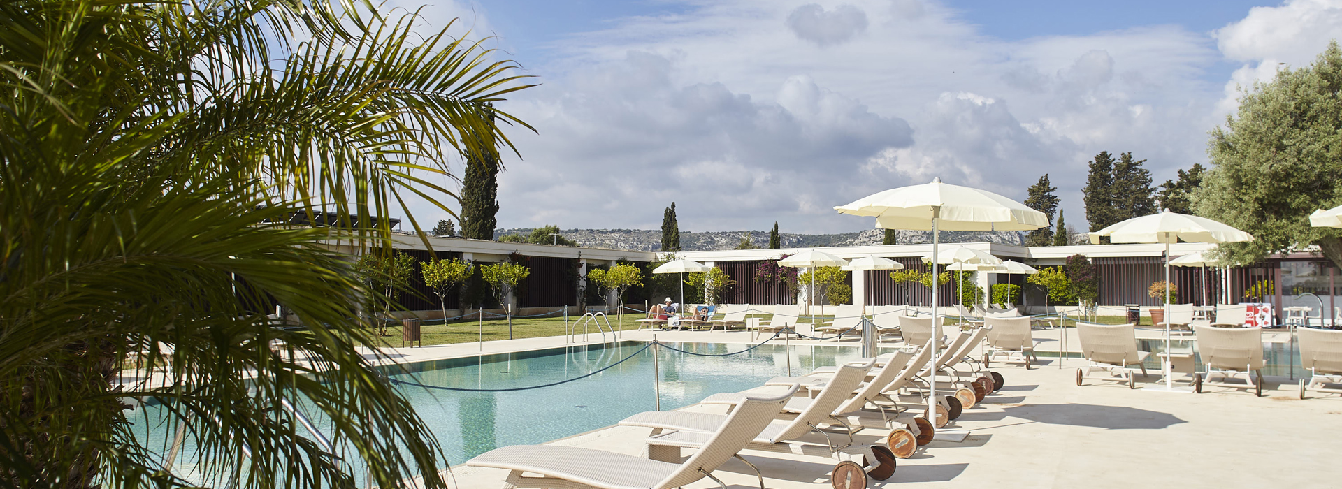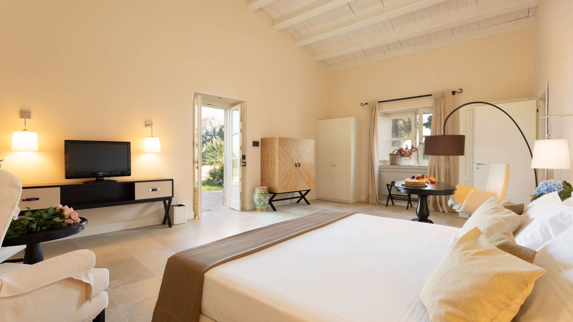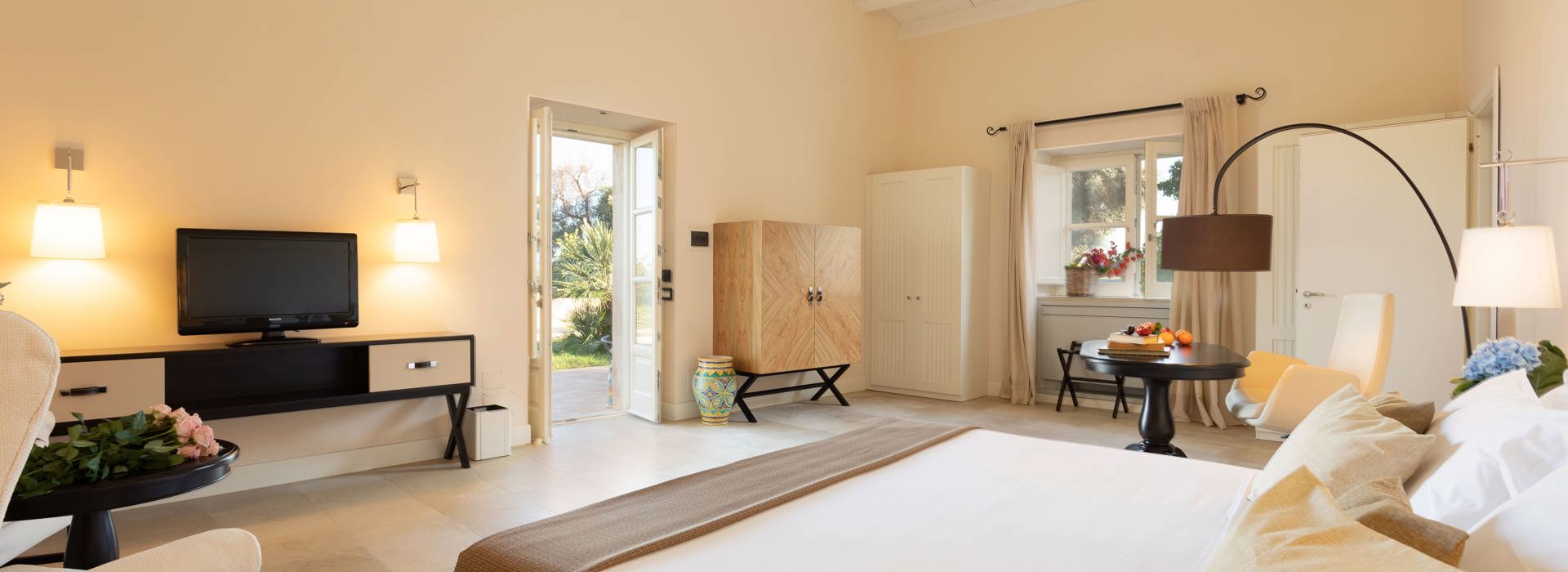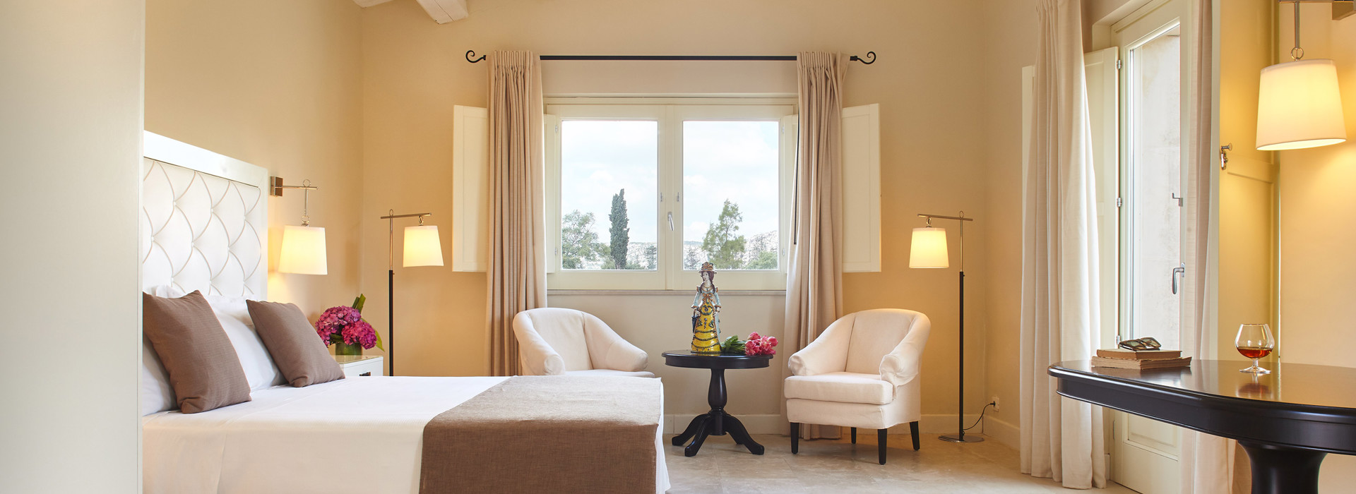 Alle 102 Zimmer (ca. 30–35 m2) und Suiten (40–55 m2) liegen im Erdgeschoss mit separatem Eingang auf drei Gebäude verteilt und bieten einen Ausblick auf die Gärten, den Golfplatz oder den antiken Innenhof. Grösstenteils mit King Bett und kleiner privater Terrasse. Die Superior Zimmer sind modern eingerichtet, die anderen Zimmerkategorien und Suiten sind im klassischen Stil gehalten. Alle Zimmer und Suiten sind ausgestattet mit Dusche, Flachbild-SatTV, Klimaanlage, Minibar, Safe und WiFi.