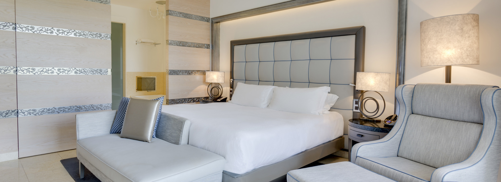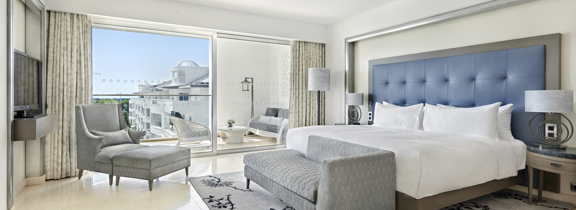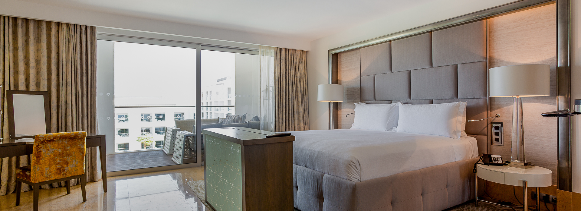 Alle 154 Zimmer (ca. 45 m2) und Suiten sind modern, sehr geschmackvoll und elegant dekoriert sowie mit jedem Komfort ausgestattet wie Bad, separater Dusche, Klimaanlage, Minibar, WiFi, Safe, DVD Player, MP3 Sound System, SatTV mit Flachbildschirm, Espressomaschine und Balkon mit Sicht in den Garten oder auf den Pool. Suiten grösser und mit separatem Wohnbereich.