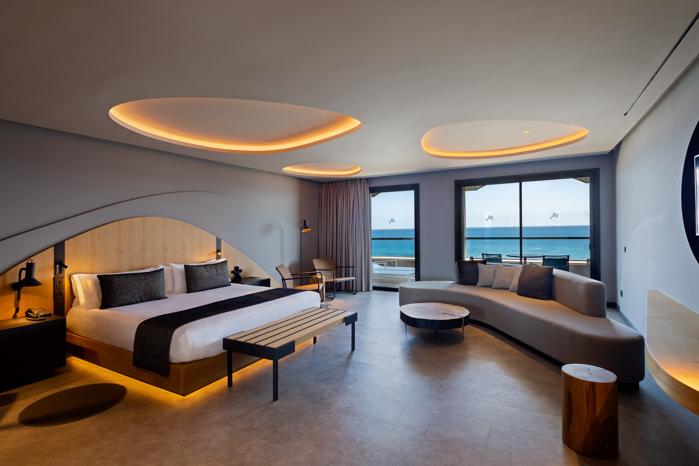 Die Deluxe Zimmer (28 m2) sind mit einem Kingsize Bett ausgestattet und das Badezimmer verfügt über eine Dusche, Haartrockner, Bademantel und Badutensilien. Sie sind buchbar mit Berg-/Strassenblick oder mit seitlichem Meerblick. Die Doppelzimmer Superior (28 m2) haben bei gleicher Ausstattung eine bessere Lage und sind buchbar mit seitlichem Meerblick oder direktem Meerblick. Die Junior Suiten (54 m2) bieten alle einen direkten Meerblick, sind geräumiger und verfügen über einen zusätzlichen gemütlichen Wohnbereich.