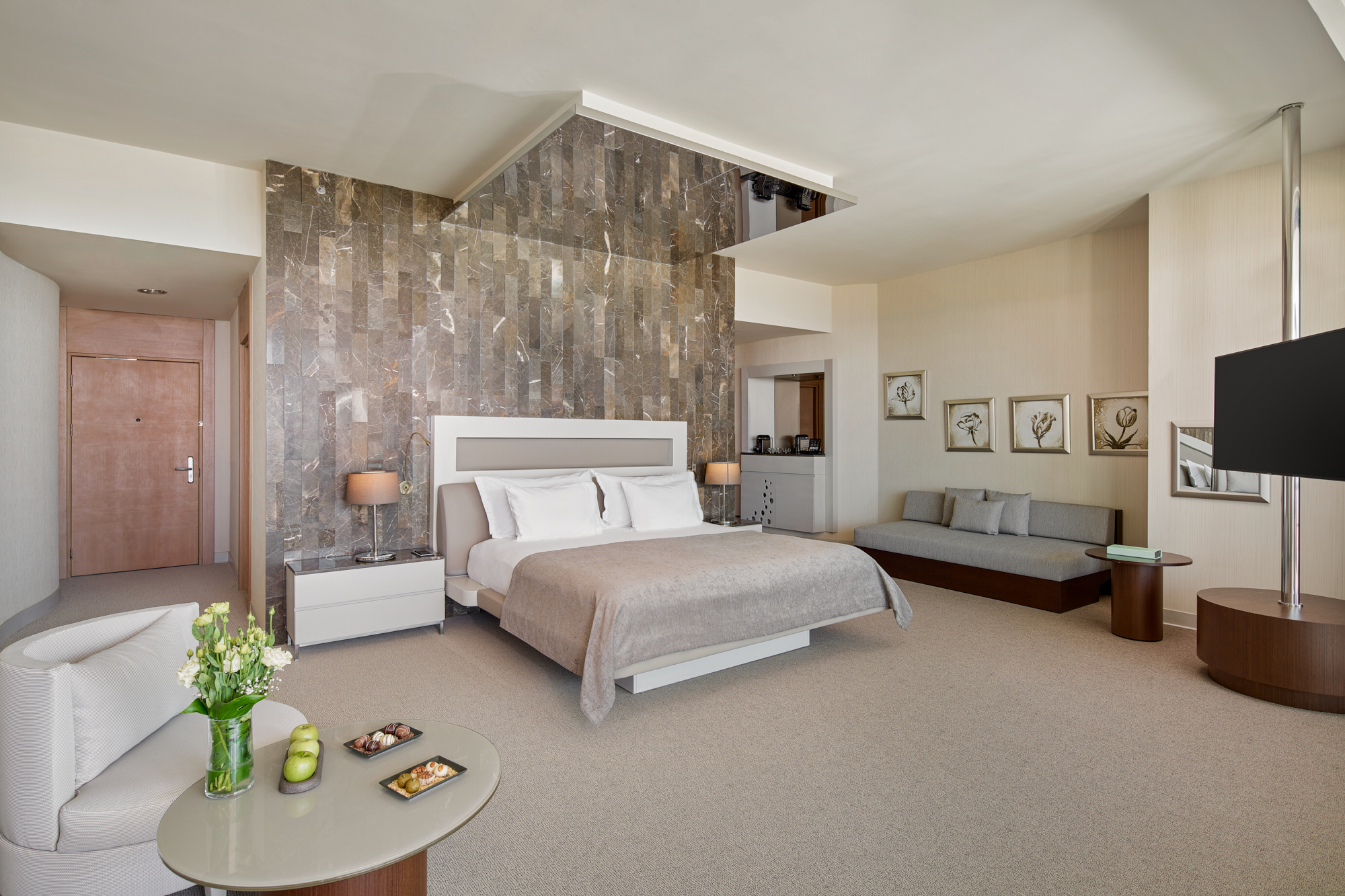 Alle Suiten wurden 2023 renoviert und vereinen nahtlos Komfort, Eleganz und Luxus. Wählen Sie Ihr gewünschtes Kissen und den Raumduft aus und personalisieren Sie so Ihren Aufenthalt. Alle Zimmer sind komfortabel ausgestattet und verfügen über Bad mit Dusche, Nespresso Kaffeemaschine, Maxx Assistant sowie einen Balkon.