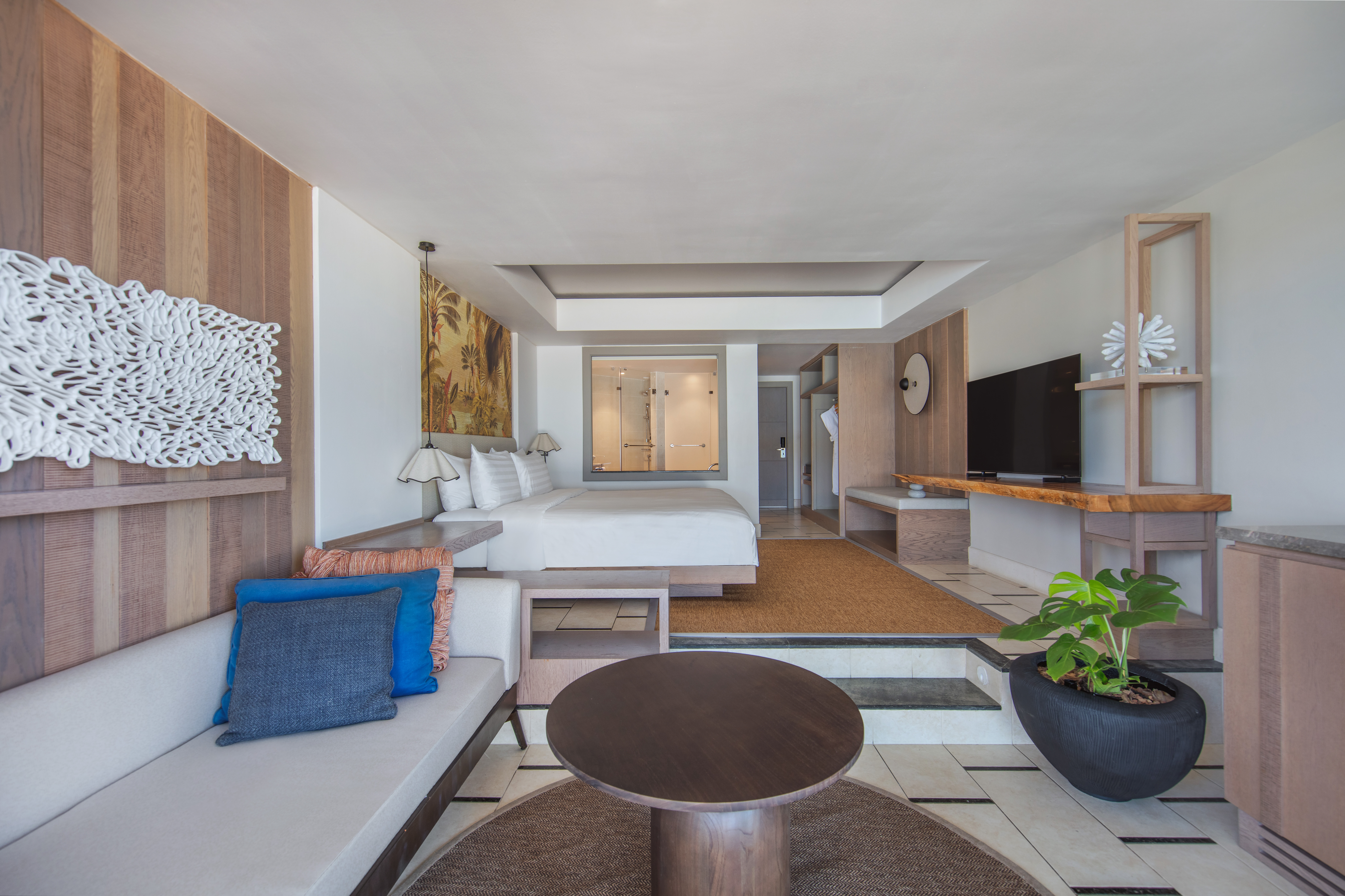 Die Architektur kombiniert moderne Eleganz mit mauritischen Einflüssen. Offene Pavillons, Bungalows und zweistöckige Reihenhäuser mit natürlichen Palmdächern und cremefarbenen Fassaden fügen sich harmonisch in die tropischen Gärten mit Wasserläufen, Palmen, kleinen Brücken und Lagunen ein. Die Innenarchitektur zeigt sich in hellen Farben, Naturmaterialien und kunstvollen Holzelementen im modernen Design. Mehrere stilvolle Poolbereiche bieten Infinity-Pools mit Meerblick, separate Familienzonen und ruhige Liegebereiche mit Sonnenliegen.