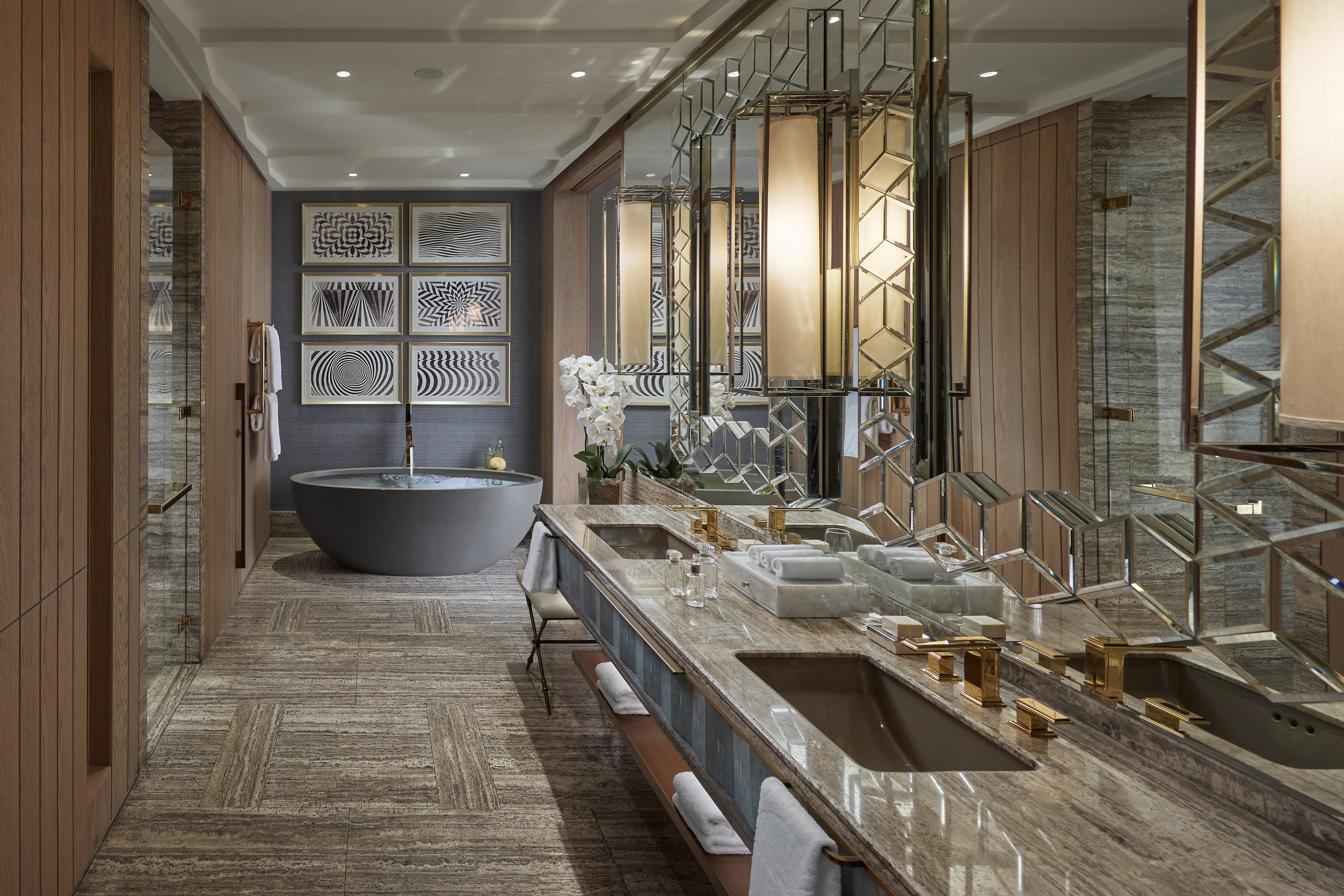 Die luxuriöse Ausstattung der Zimmer, die in kräftigen Blautönen durch neutrale Erdfarben und glitzerndes Gold akzentuiert werden, ist aus edelsten Materialien, wie weiss-schwarzem Statuario Marmor und edle Spiegelschliffe im grossen Badezimmer, das offen zum Wohnraum ist. Badewanne, separate begehbare Dusche, WC und ein doppelter grosser Waschtisch geben den Zimmern das Gefühl von einmaligem Luxus. Eichengetäfelte Foyers, mit Perlmutt intarsiertere schwarze Lackstühle und raumhohe Fenster bieten in den Zimmern eindrucksvolle Blicke auf die atemberaubende Skyline der Stadt oder über das Meer mit und ohne Balkon/Terrassen. Zu den weiteren Annehmlichkeiten gehören ein Kissen Menü, HD Smart TV, eine Nespresso Kaffeemaschine und eine grosszügige Minibar.
