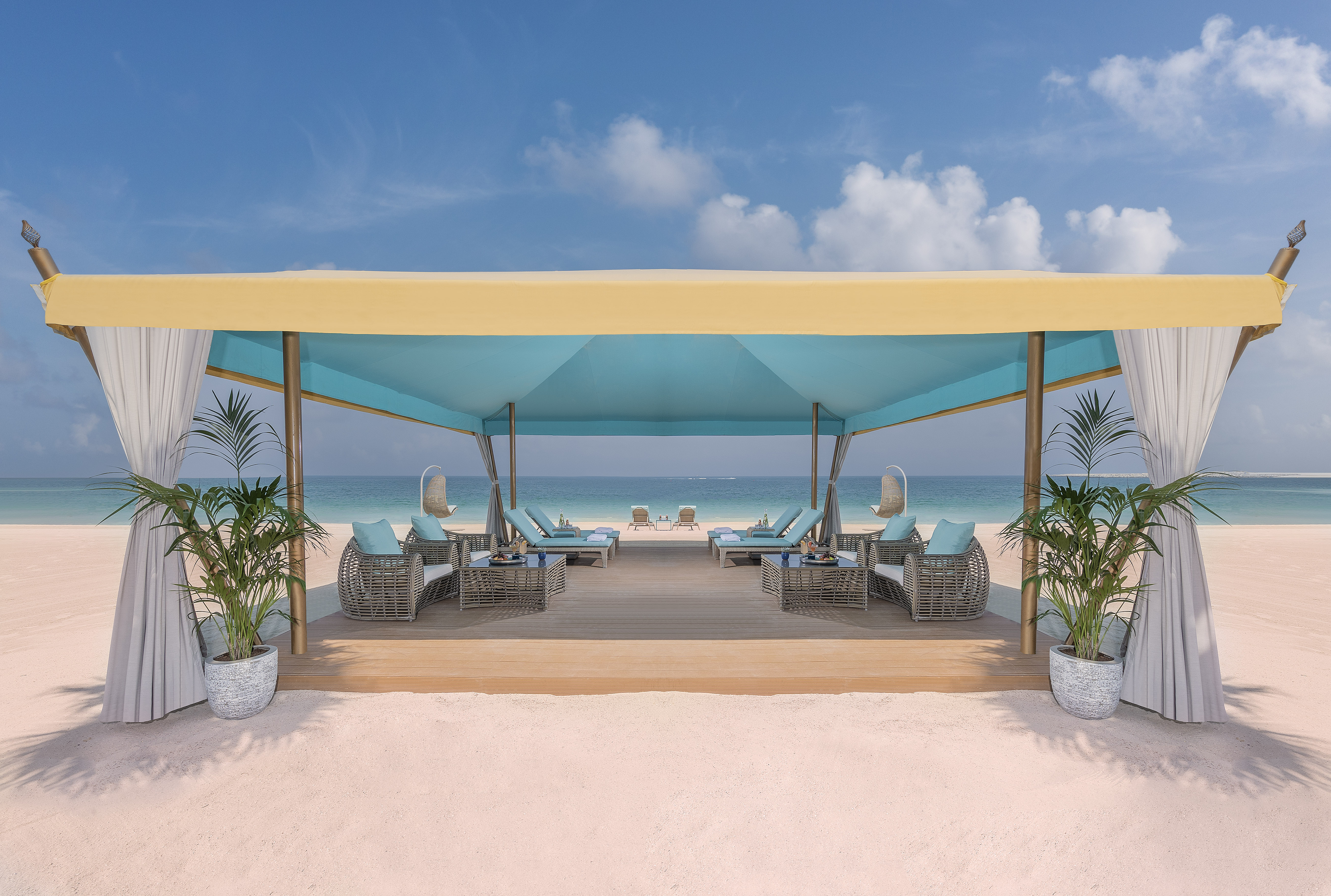 Ein grosser, sehr speziell angelegter Outdoor Pool, kombiniert mit einem Kinderbecken, und ein grosser privater Strandbereich mit Liegen und Cabanas laden zu einem luxuriösem Strand- und Badeurlaub ein.